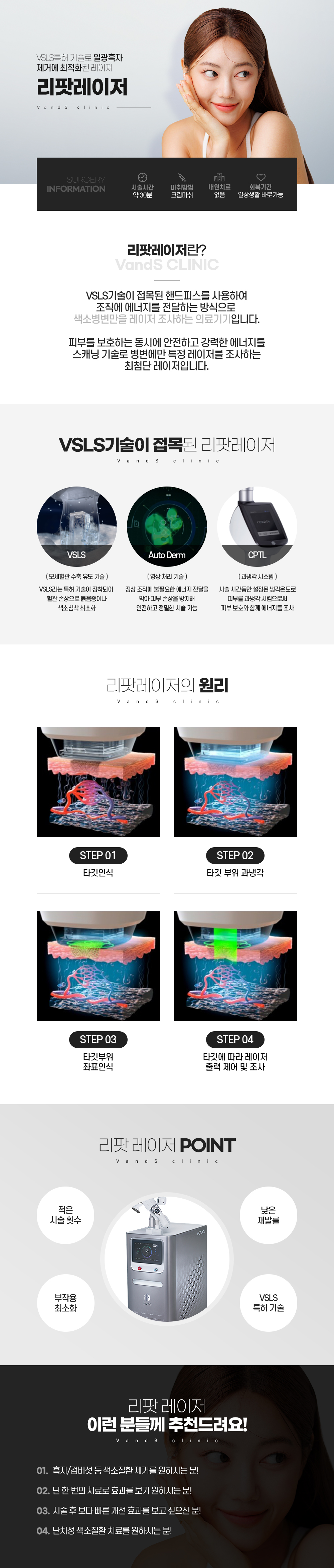 VSLS 기술이 접목된 핸드피스를 사용하여 조직에 에너지를 전달하는 방식으로 색소병변만을 레이저 조사하는 의료기기 입니다. 피부를 보호하는 동시에 안전하고 강력한 에너지를 스캐닝 기술로 병변에만 특정 레이저를 조사하는 최첨단 레이저 입니다.