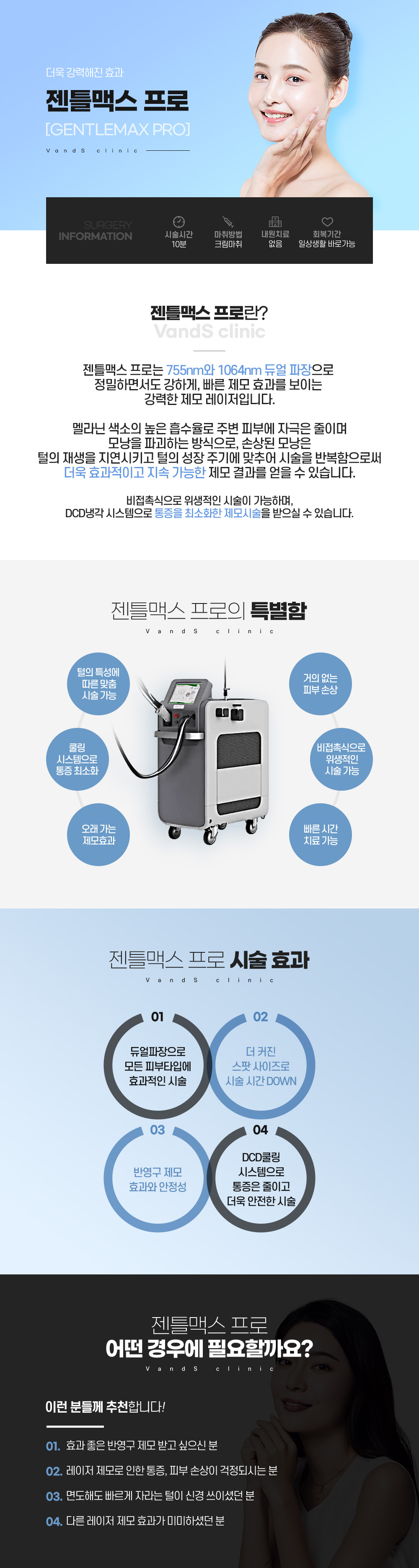 깔끔하게 털 제거를 원하는 모든 부위(얼굴/바디)에 시술 가능하며 짧은 시술시간과 적은 통증으로 간편하게 제모할 수 있습니다.